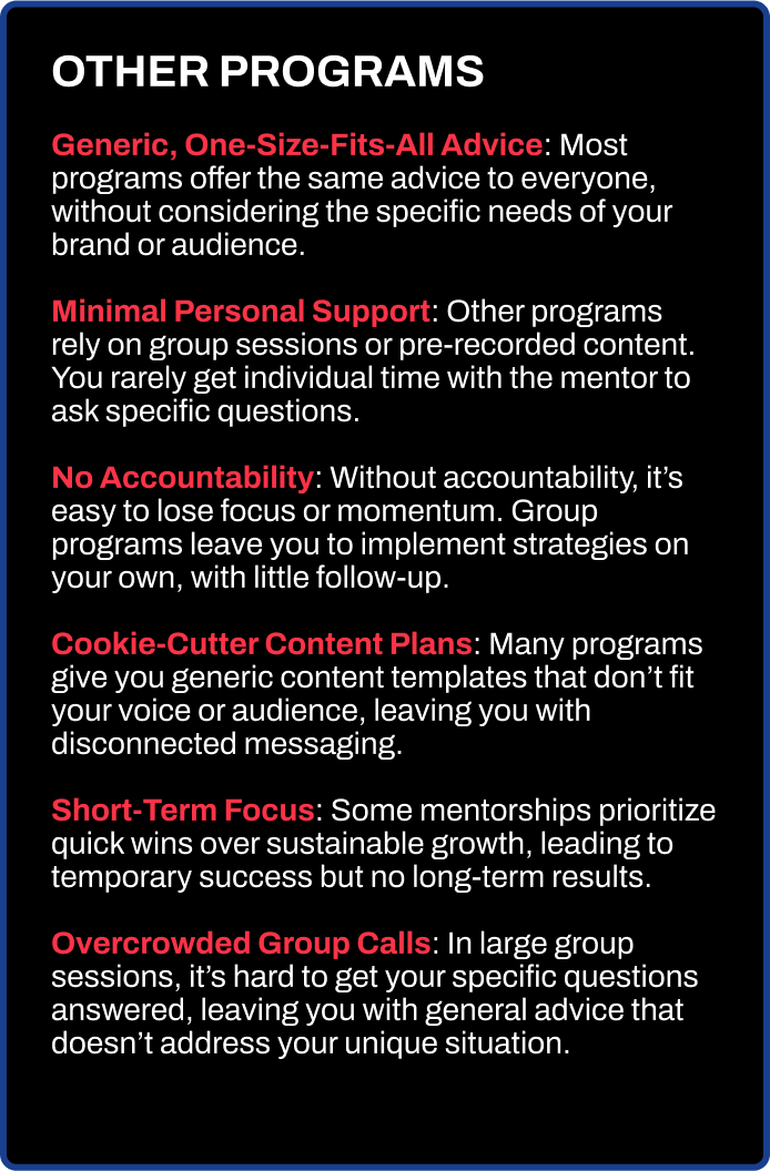 If you’re satisfied with one-size-fits-all solutions and don’t need tailored guidance specific to your brand, then group programs may be more suited for you.