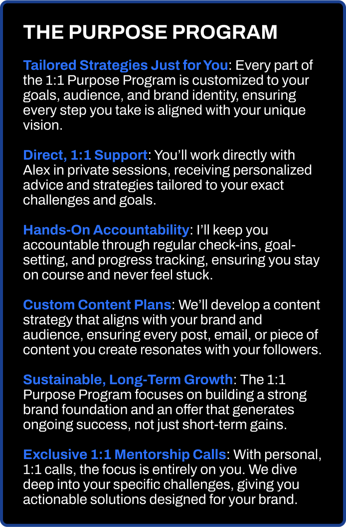 I’ve worked with countless creators and entrepreneurs who needed more than just generic advice.They needed personalized, step-by-step mentorship.The 1:1 Purpose Program was designed to give you hands-on support to build your brand, position yourself as an authority, and develop a profitable offer.